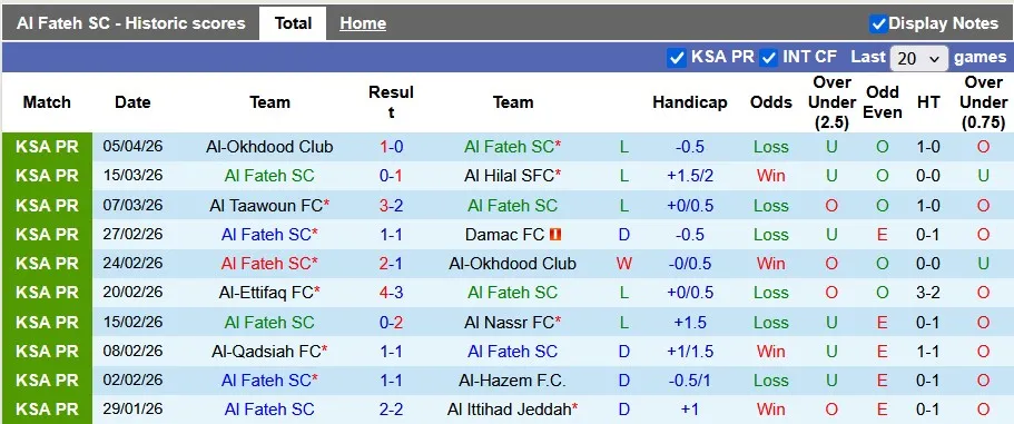 Thống kê phong độ 10 trận đấu gần nhất của Al Fateh