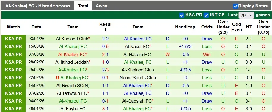 Thống kê phong độ 10 trận đấu gần nhất của Al-Khaleej