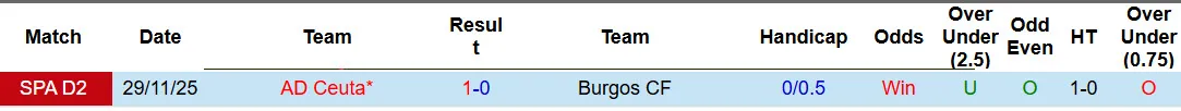 Trận đấu lượt đi giữa Burgos và AD Ceuta chỉ có 1 bàn thắng được ghi.7/8 trận đấu mới đây của Burgos có không quá 2 bàn/trận.