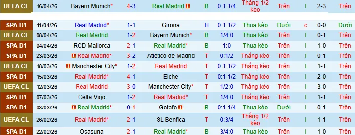 Thống kê phong độ 10 trận đấu gần nhất của Real Madrid