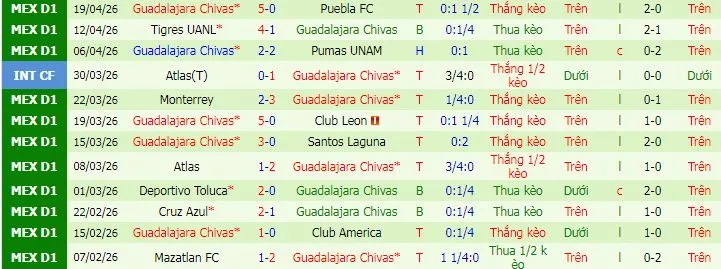 + Guadalajara thắng 2/3 trận mới nhất trên sân khách theo kèo châu Á.