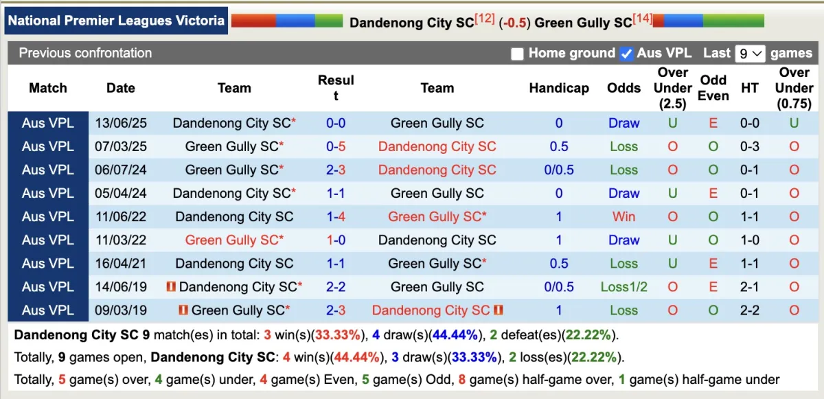 Trong 3 lần đối đầu gần nhất giữa hai câu lạc bộ, Dandenong City SC không thua kèo và có đến 2 lần thắng kèo. Ở vòng đấu gần nhất đội bóng này đã trở lại với một chiến thắng cách biệt 3 bàn ấn tượng và vượt ải Handicap. Trong khi đó 7/9 trận liên tiếp của Green Gully SC không thắng kèo, do đó có thể chủ nhà đáng để tin tưởng ở kèo châu Á.