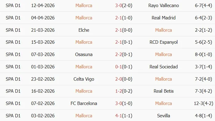 Thống kê phong độ 10 trận đấu gần nhất của Mallorca