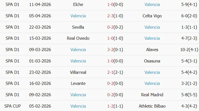Thống kê phong độ 10 trận đấu gần nhất của Valencia
