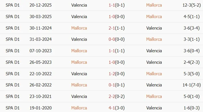 Thống kê phong độ, lịch sử đối đầu của Mallorca vs Valencia