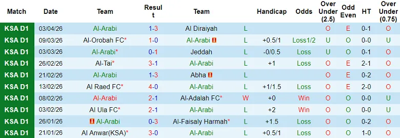 Toàn bộ 3 lần so tài thuộc giải Saudi First Division kể từ tháng 8/2024 giữa Al Arabi và Al Zulfi đều không xuất hiện nhiều hơn 2 bàn thắng. Kịch bản quen thuộc ấy hứa hẹn tái diễn khi hai đội thi đấu vòng 28 mùa 2025/26.