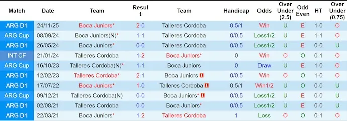 Trong 10 lần gặp nhau gần nhất, Boca Juniors có 6 chiến thắng, Talleres có 2 chiến thắng và 2 trận hòa. Tuy nhiên, trên sân của Talleres, kết quả không hoàn toàn nghiêng về Boca Juniors.
