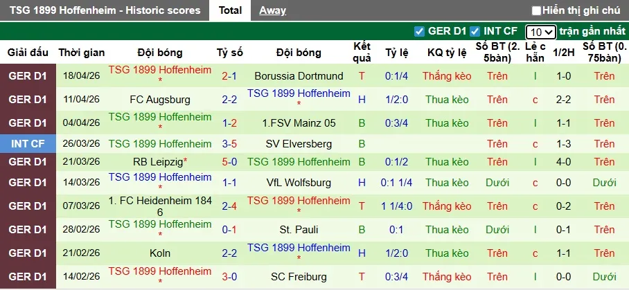 Thống kê phong độ 10 trận đấu gần nhất của Hoffenheim
