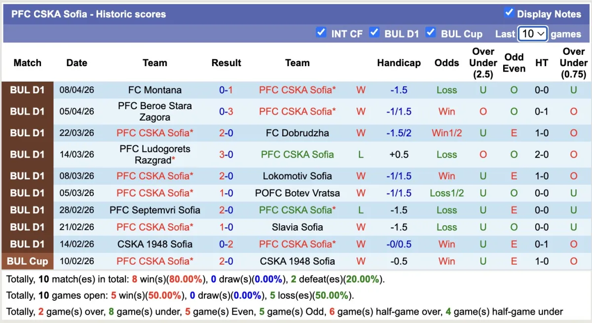-Thống kê phong độ 10 trận đấu gần nhất của PCSKA Sofia