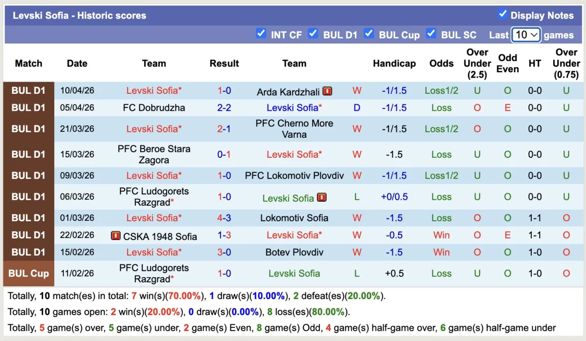 -Thống kê phong độ 10 trận đấu gần nhất của Levski Sofia