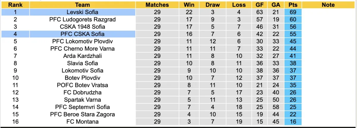 Bảng xếp hạng bóng đá Giải VĐQG Bulgaria 2026