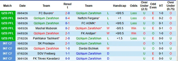 Thống kê phong độ 10 trận đấu gần nhất của Qizilqum Zarafshon