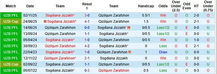 3 trong số 5 trận đối đầu vừa qua giữa Qizilqum Zarafshon vs Sogdiana Jizzakh có không quá 2 bàn/trận. 7/10 trận đấu mới đây của Qizilqum Zarafshon có tỷ số xỉu 2 1/4.