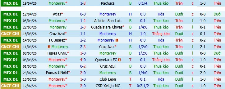 + Monterrey thua 8 hòa 1 chỉ thắng 1 trong 10 trận gần nhất trên sân nhà theo kèo châu Á.