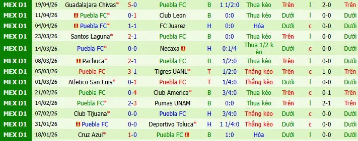 + Puebla đã vượt qua mức chấp +1.25 trong 9/10 trận sân khách gần nhất của họ.