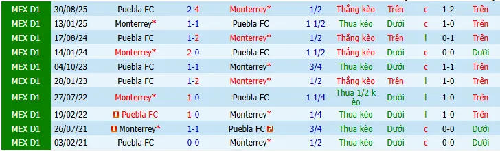 + Monterrey đã không vượt qua được mức chấp -1.25 trong 8/10 trận gần nhất gặp Puebla.