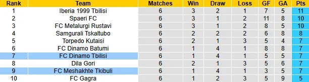 Thống kê phong độ 10 trận gần nhất của Dinamo Tbilisi