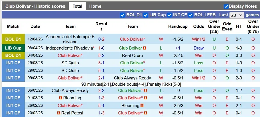 Thống kê phong độ 10 trận đấu gần nhất của Club Bolivar