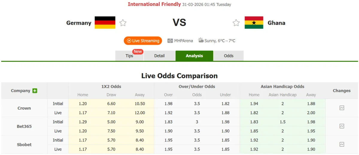 Trận đấu giao hữu giữa đội tuyển Đức và Ghana sẽ diễn ra vào lúc 01h45 ngày 31/3. Tại dudoanmacao.live, các chuyên gia hàng đầu sẽ đưa ra những phân tích sâu sắc về tỷ lệ kèo châu Âu và châu Á, cũng như dự đoán kết quả của cuộc đối đầu hấp dẫn này giữa Đức và Ghana.