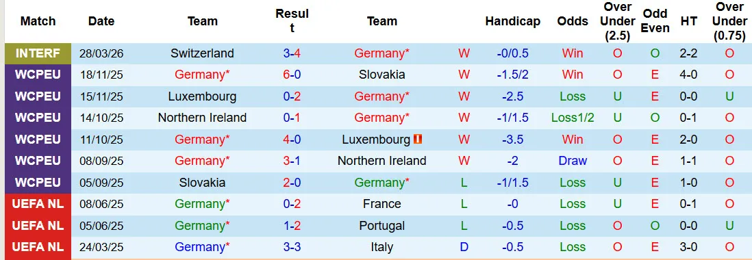 Thống kê phong độ 10 trận đấu gần nhất của Đức.