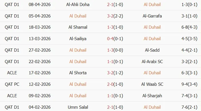 Dưới đây là thống kê phong độ 10 trận đấu gần nhất của Al Duhail, giúp chúng ta hiểu rõ hơn về phong độ hiện tại của đội bóng này.