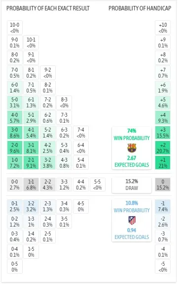 Trong các tỷ số có thể thắng của đội chủ nhà, tỷ số 2-0 có xác suất cao nhất với 9,6%, tiếp theo là 2-1 với 9,1%, 3-0 với 8,6% và 3-1 với 8,1%. Đối với Atletico, tỷ số 2-1 có xác suất cao nhất với 3,2%.