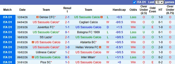 Thống kê phong độ 10 trận gần nhất của Sassuolo