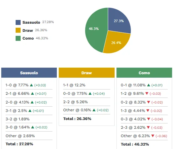 Theo phân tích về phong độ thi đấu cũng như số liệu thống kê của từng cầu thủ, kết quả có khả năng xảy ra nhất ở trận đấu này là Sassuolo thắng với xác suất 27.3%. Một chiến thắng dành ho Como có xác suất là 46.3% và một trận hòa có khả năng xảy ra là 26.4%.