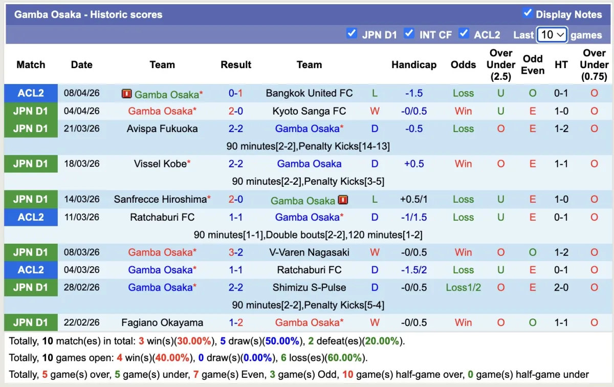 -Thống kê phong độ 10 trận đấu gần nhất của Gamba Osaka