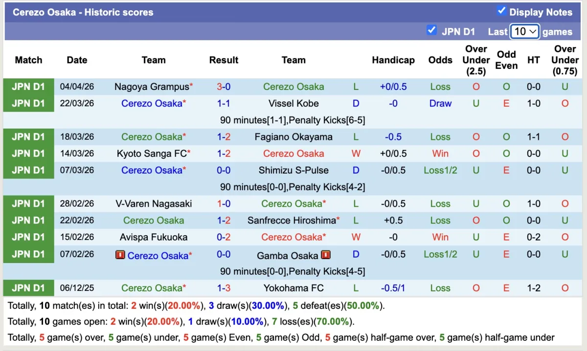 -Thống kê phong độ 10 trận đấu gần nhất của Cerezo Osaka