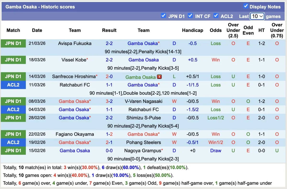 -Thống kê phong độ 10 trận đấu gần nhất của Gamba Osaka