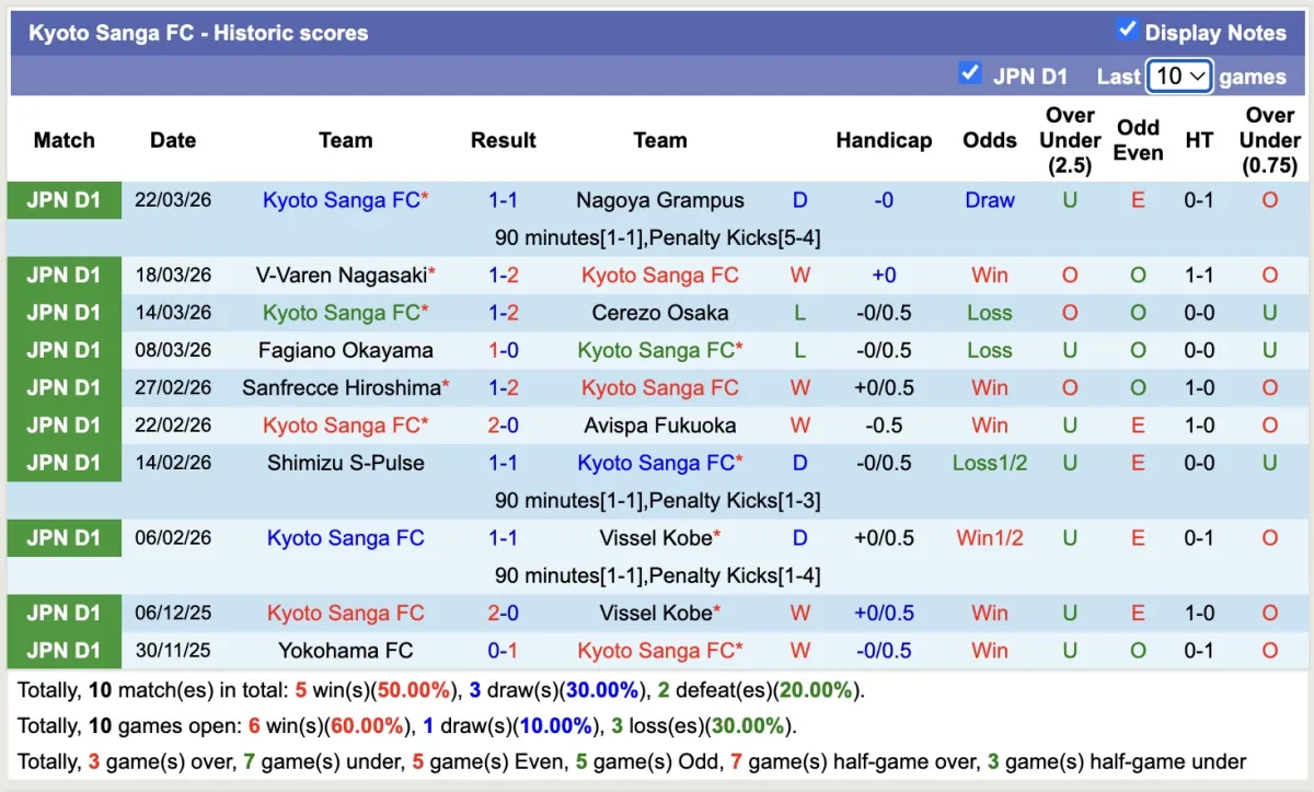 -Thống kê phong độ 10 trận đấu gần nhất của Kyoto Sanga