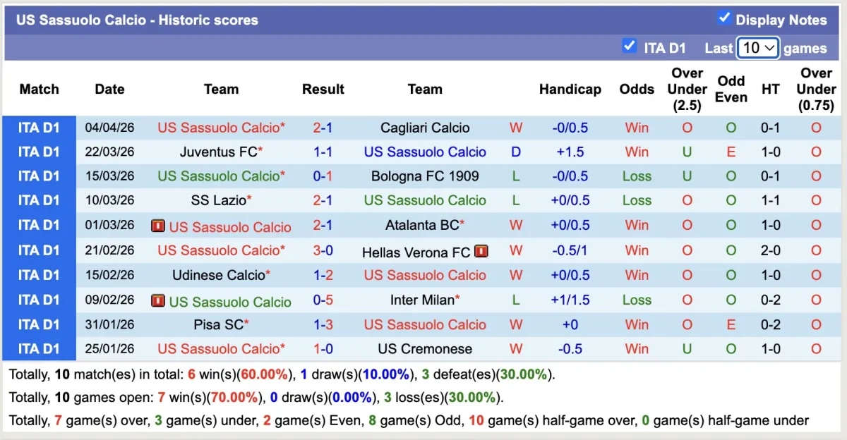 -Thống kê phong độ 10 trận đấu gần nhất của Sassuolo