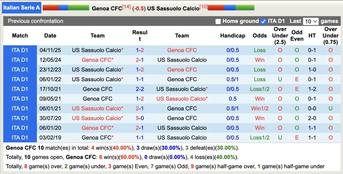 Trên tổ ấm của mình Genoa đang chiếm được niềm tin của giới đầu tư khi 4/6 trận gần nhất đều thắng kèo. Trong khi đó quá khứ đang chỉ ra rằng 5 lần đối đầu gần nhất giữa hai câu lạc bộ Sassuolo đều thua kèo, do đó có thể chủ nhà sẽ là một chọn lựa không ngoan.