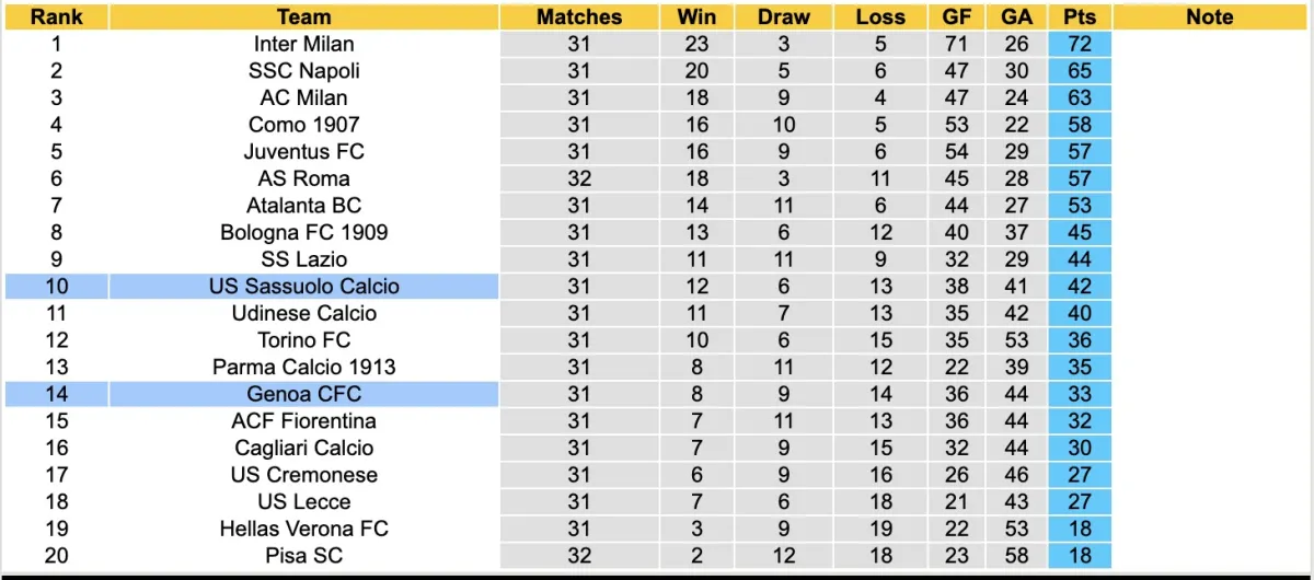Bảng xếp hạng bóng đá Giải VĐQG Ý 2026