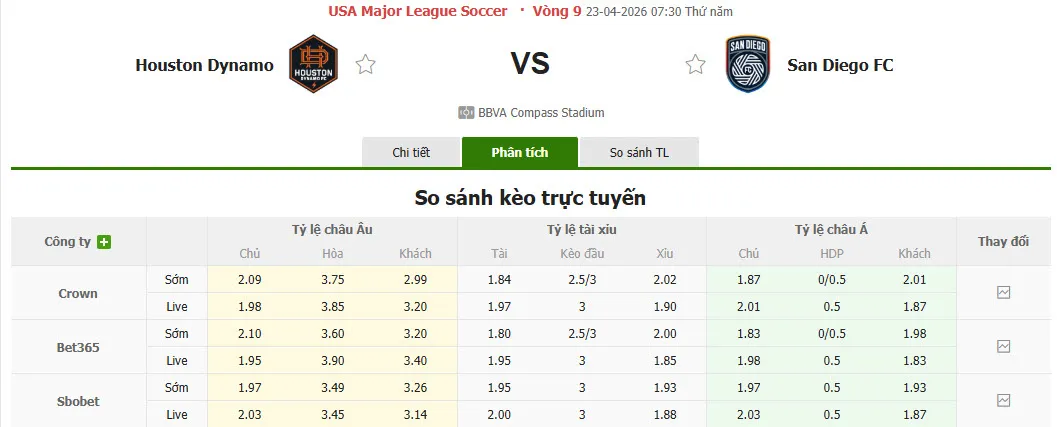 Trận đấu giữa Houston Dynamo và San Diego tại giải Nhà nghề Mỹ sẽ diễn ra vào lúc 07h30 ngày 23/4. Để có cái nhìn tổng quan về khả năng chiến thắng của hai đội, các chuyên gia tại dudoanmacao.live sẽ phân tích và đưa ra dự đoán kết quả trận đấu dựa trên tỷ lệ kèo châu Âu và châu Á.