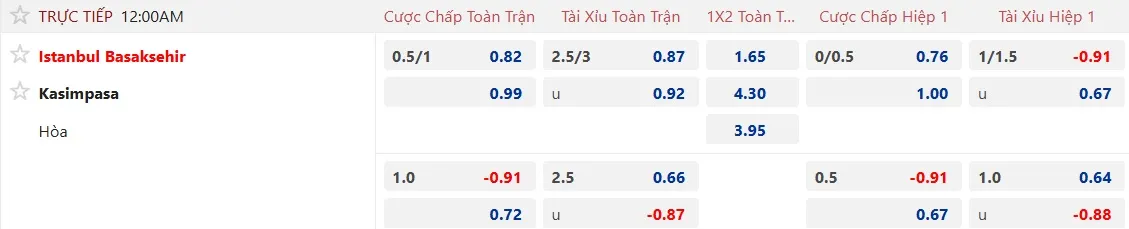 Sàn giao dịch châu Á ghi nhận mức kèo Istanbul BB chấp 3/4 trái, tỷ lệ mà ở trận đối đầu gần nhất xuất hiện chứng kiến họ đánh bại Kasimpasa trên sân nhà của mình. Tính xa hơn, Istanbul BB thắng kèo châu Á 8/9 trận đối đầu gần nhất. Istanbul BB cũng đang thắng kèo 2 trận liên tiếp gần đây và nhiều khả năng sẽ chặn đứng mạch 6 trận thắng kèo liên tiếp của Kasimpasa.