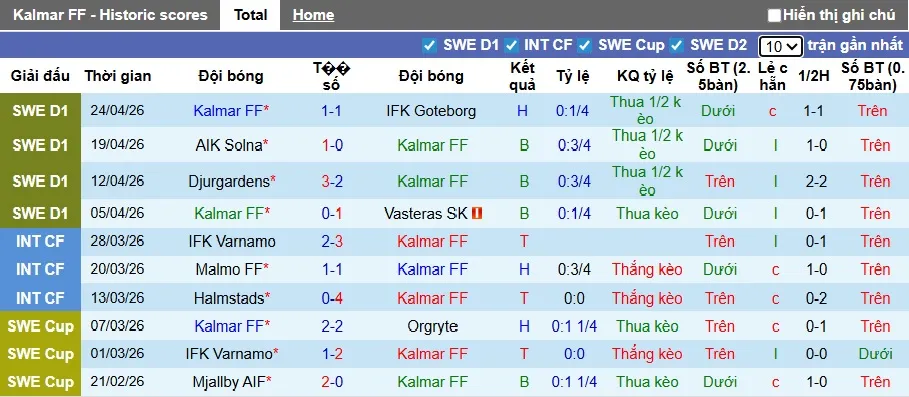 Các cầu thủ Kalmar cùng đội bét bảng GAIS đang là hai cái tên có tỷ lệ thắng kèo châu Á bằng… 0 sau 4 lượt trận đầu tiên của mùa giải VĐQG Thụy Điển 2026. Ở chiều ngược lại, Elfsborg thắng kèo 4 và hòa 1 trong 5 trận đấu vừa qua, trong đó có 1 trận thắng kèo khi xuất hiện tỷ lệ 0:0 như trận đấu đêm nay. Chưa kể, Elfsborg cũng thắng kèo châu Á 4/5 chuyến làm khách gần nhất tới sân của Kalmar.