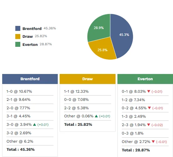 Theo phân tích về phong độ thi đấu cũng như số liệu thống kê của từng cầu thủ, kết quả có khả năng xảy ra nhất ở trận đấu này là Brentford thắng với xác suất 45.3%. Một chiến thắng dành cho Everton có xác suất là 28.9% và một trận hòa có khả năng xảy ra là 25.8%.