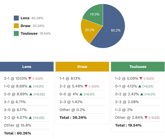 Tỷ số có khả năng xảy ra nhất để Lens thắng là 2-1 với xác suất 10,13%. Các tỷ số có khả năng xảy ra tiếp theo là 1-0 (8,69%) và 2-0 (8,69%). Tỷ số hòa có khả năng xảy ra nhất là 1-1 (9,13%), trong khi tỷ số thắng của Toulouse là 1-2 (5,09%).