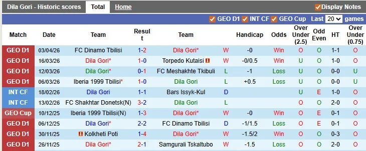 Thống kê phong độ, lịch sử đối đầu của Dila Gori đấu vs Gagra