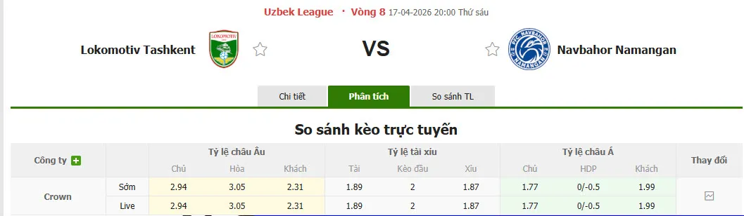Trong 6 trận đấu vừa rồi giữa Lokomotiv Tashkent và Navbahor Namangan, Lokomotiv Tashkent đã thua kèo cả 6 lần. Ngoài ra, Lokomotiv Tashkent cũng thua kèo tới 4/5 trận đấu gần đây tại giải VĐQG. Trong khi đó, Navbahor Namangan lại thắng kèo cả 2 trận đấu gần nhất tại giải VĐQG.