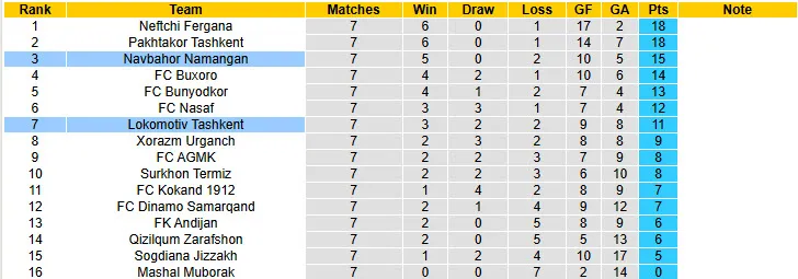 Trong 8 trận đấu vừa rồi giữa Lokomotiv Tashkent và Navbahor Namangan tại mọi đấu trường, Lokomotiv Tashkent đã thua tới 7 trận. Ngoài ra, Lokomotiv Tashkent cũng không thắng tới 4/5 trận đấu gần nhất tại giải VĐQG. Trong khi đó, Navbahor Namangan lại toàn thắng 3 trận đấu gần đây tại giải VĐQG.