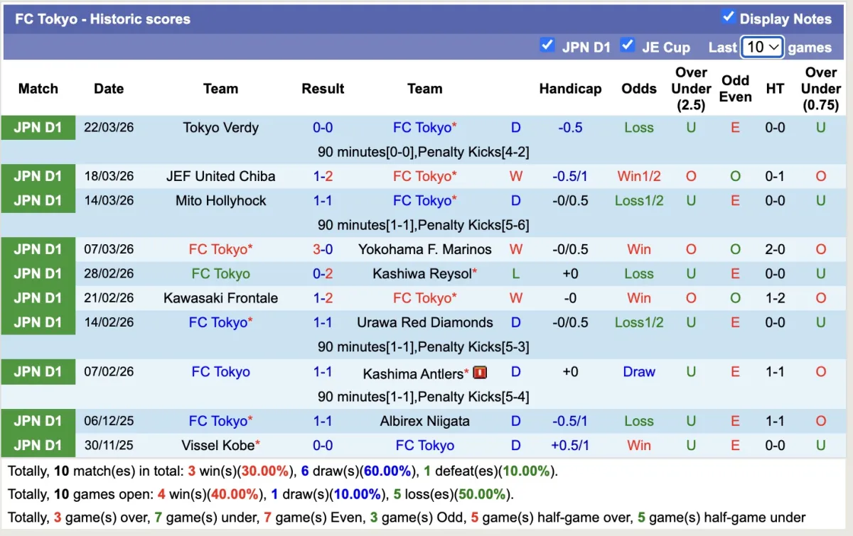 -Thống kê phong độ 10 trận đấu gần nhất của Tokyo