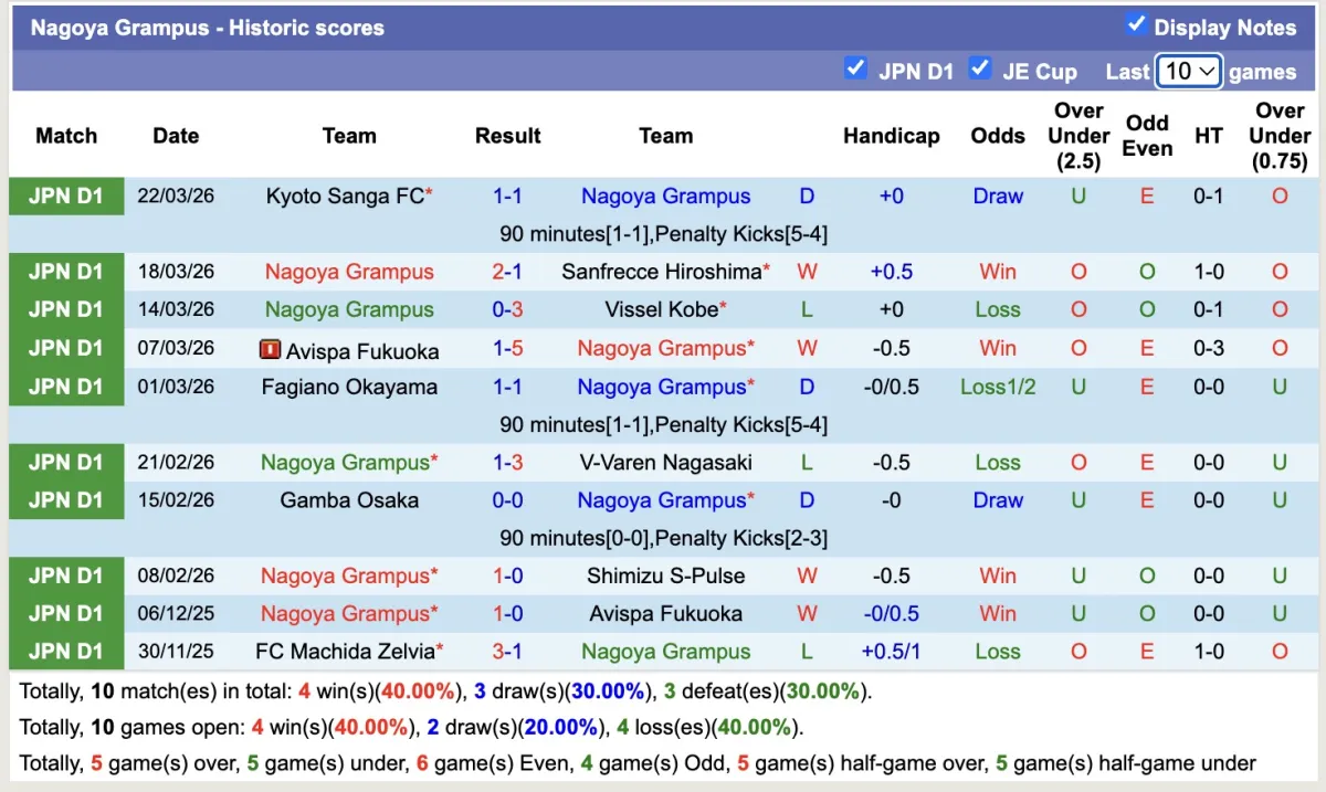 -Thống kê phong độ 10 trận đấu gần nhất của Nagoya Grampus