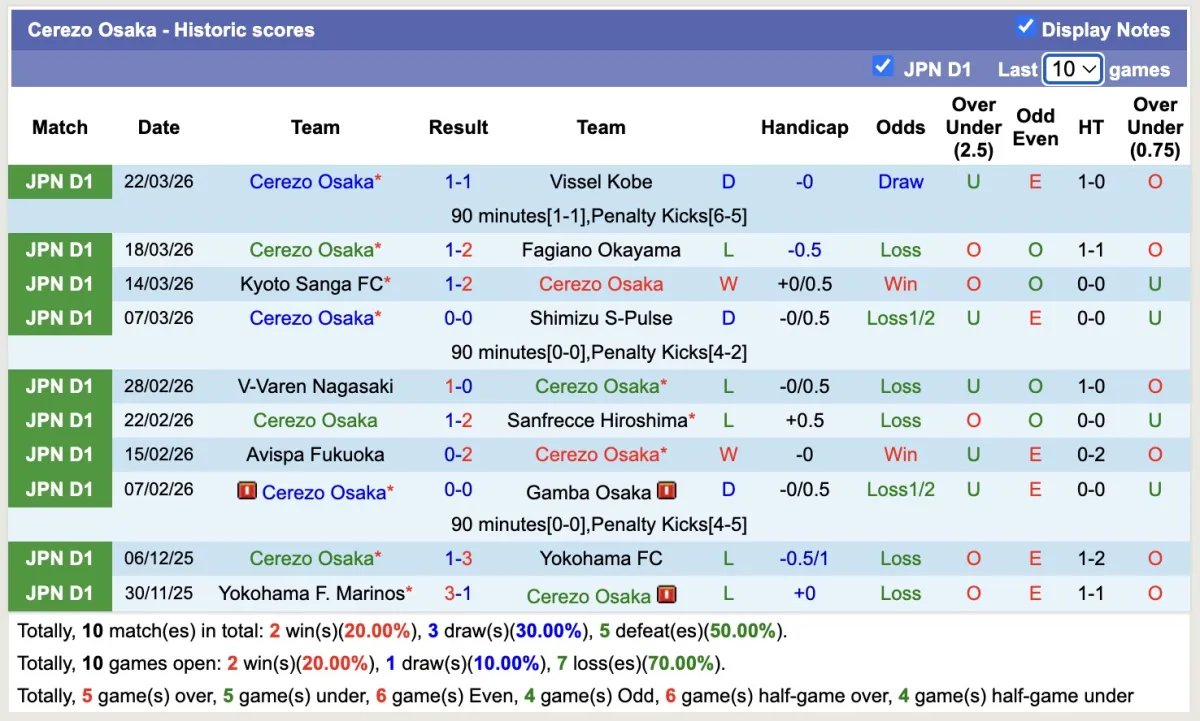 -Thống kê phong độ 10 trận đấu gần nhất của Cerezo Osaka