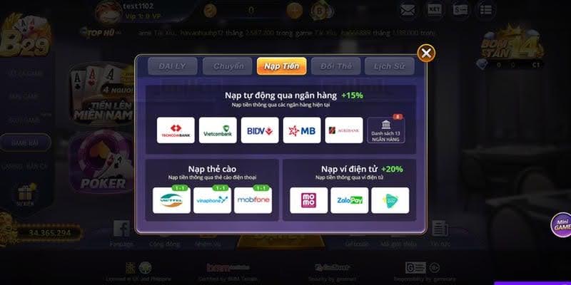 B29 hỗ trợ nhiều kênh nạp phổ biến như chuyển khoản ngân hàng, ví điện tử, mã QR và thẻ thanh toán. Người chơi có thể linh hoạt chọn phương thức phù hợp với nhu cầu của mình. Mỗi lựa chọn đều được hướng dẫn chi tiết giúp bạn thực hiện thao tác nhanh nhất.