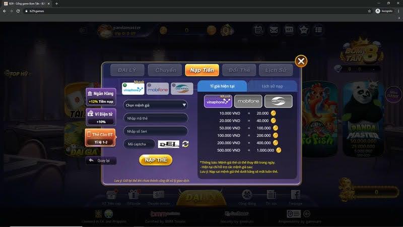 Người chơi đăng nhập vào trang chủ B29 sau đó chọn mục Nạp tiền. Tại đây bạn chọn phương thức thanh toán mình muốn sử dụng, nhập số tiền cần nạp và làm theo hướng dẫn của hệ thống. Sau khi xác nhận, tiền sẽ được cộng vào tài khoản trong vài giây. Giao diện web rất mượt nên người dùng thao tác cực kỳ thoải mái.
