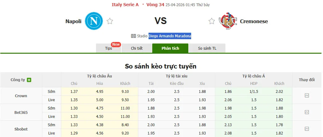 Nhận định soi kèo Napoli vs Cremonese, 01h45 ngày 25/4 tại VĐQG Italia. Phân tích tỷ lệ kèo, dự đoán kết quả Napoli đấu với Cremonese từ tỷ lệ châu Âu, châu Á qua các chuyên gia hàng đầu.