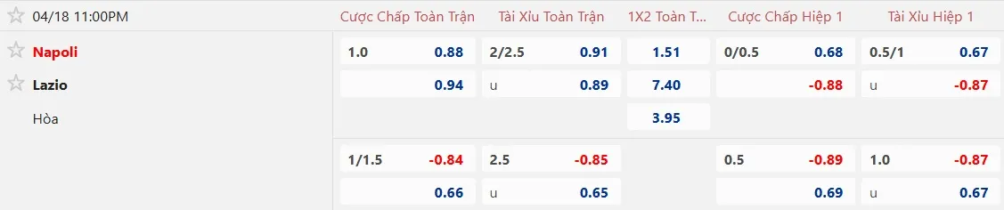 2 trận đối đầu gần nhất chấp 1 trái, trên sân nhà Napoli đều nhận thất bại trước Lazio. Tuy nhiên, kịch bản này có thể sẽ thay đổi ở màn so tài đêm nay, khi đội bóng thành Naples đang có thành tích thắng kèo 2/3 trận gần đây và nó trái ngược với 2 trận thua kèo liên tiếp của Lazio.